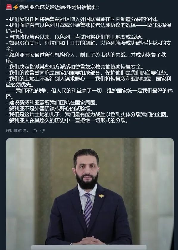 從這次朱拉尼的瞻前顧後,乃至搞出正規軍進城之後又撤出的騷操作來看,朱拉尼對以色列在蘇韋達省主張的利益還是相當忌憚的,生怕自己做的過火了刺激到了以色列。