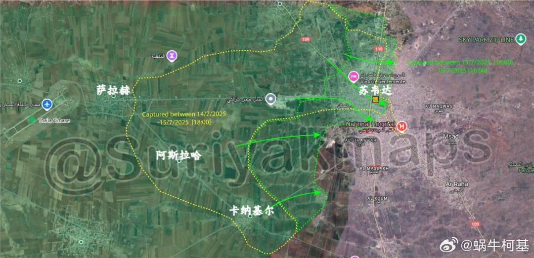 在朱拉尼正規軍的全力進攻下,之前擊敗了朱拉尼內政部警察的德魯茲民兵先勝後敗,短短半天時間就被朱拉尼部隊推平了一半,半個蘇韋達又落入了朱拉尼部隊手中。