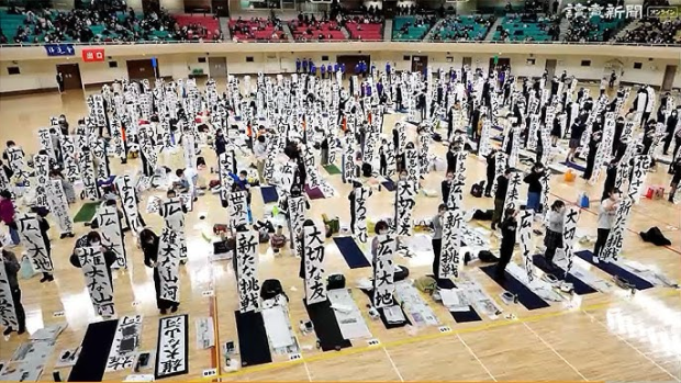 所謂的“熱血書法”,就是近幾年日本學生中流行表演的集體書法——隨着音樂節奏,在特製的巨型宣紙上各自書寫,最後變成一個寫滿激勵話語的巨型橫幅。年輕人故意打破“安靜書寫”的傳統,以求創造出的新型團體活動。