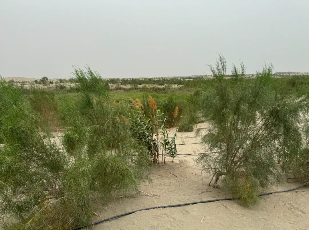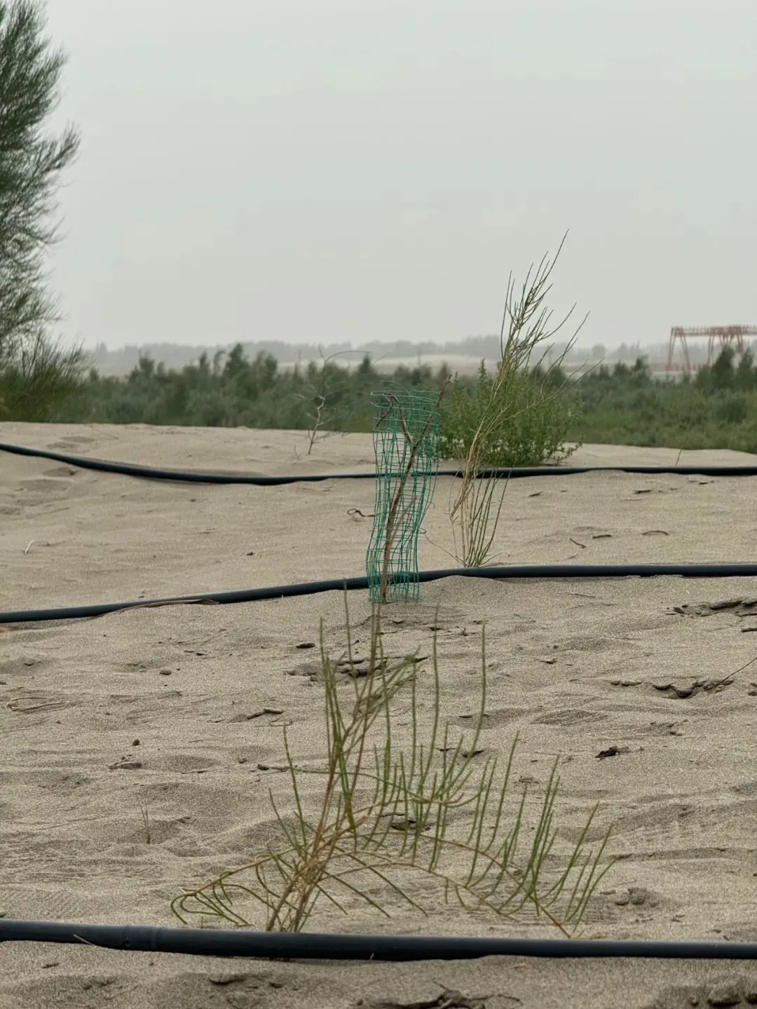沙地裏種植梭梭等固沙植物,搭配滴灌設施,推進荒漠化治理與植被恢復