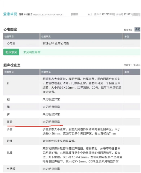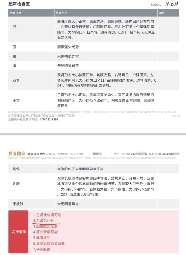 2023年體檢時,張律師發現右腎有鈣化現象,當時詢問了愛康國賓的醫生,得到的答覆是“沒問題,就像手指頭劃破結痂一樣”。