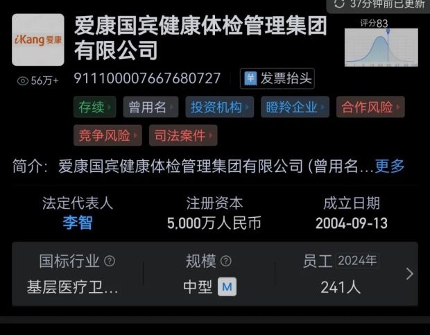 據天眼查App顯示,愛康國賓健康體檢管理集團有限公司成立於2004年9月,法定代表人為李智,註冊資本5000萬人民幣,經營範圍包括醫院管理、企業管理、健康諮詢服務等,由愛康健康科技集團有限公司全資持股。周邊風險信息顯示,愛康國賓旗下多家公司均曾涉及醫療糾紛。