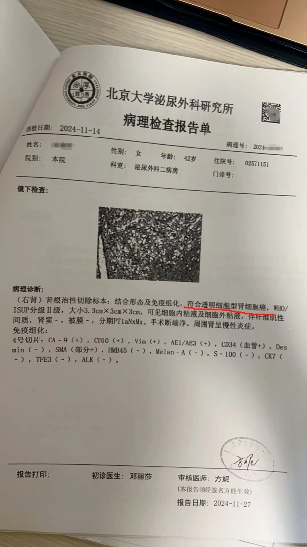 2024年8月底,她開始出現持續腰疼的症狀,於是在北大康復醫院進行了體檢。檢查發現其右腎存在囊腫,進一步在醫院做了增強CT,結果顯示右腎透明細胞癌。隨後的手術切除了右腎,但她的腰疼並未緩解。