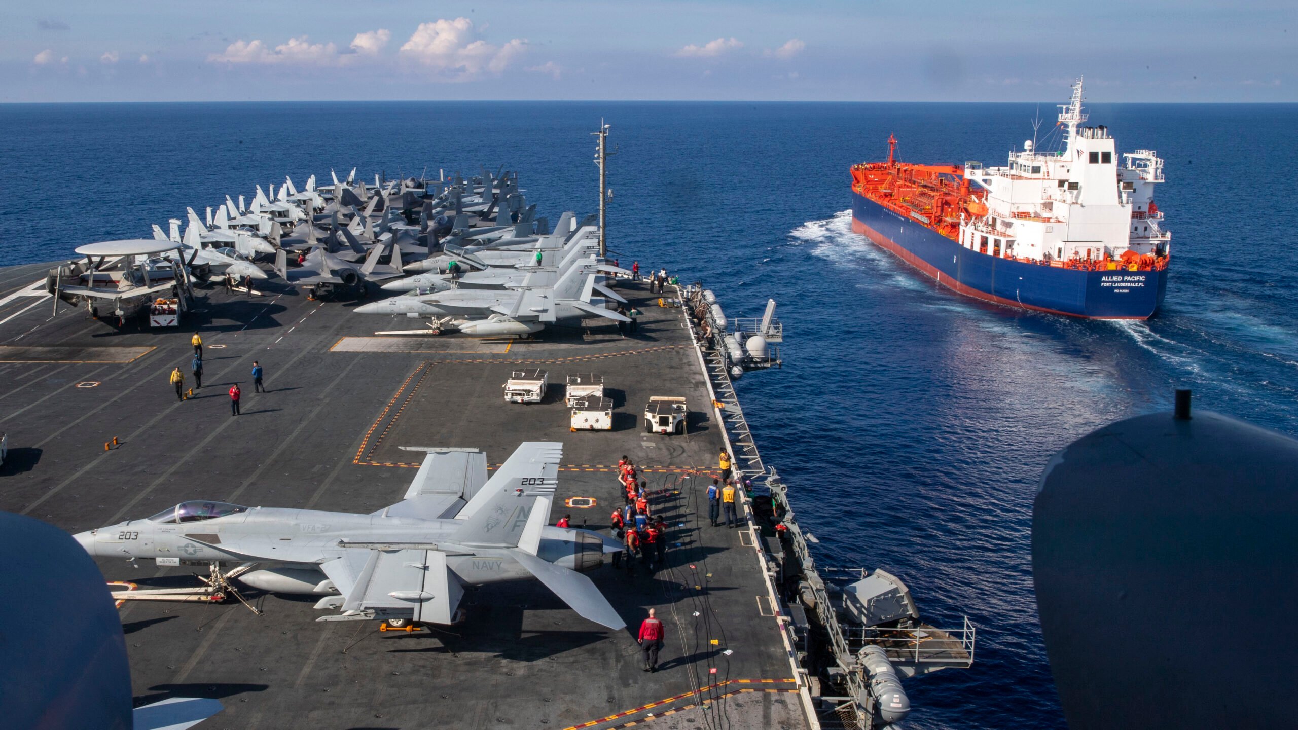 2025年6月28日,在菲律賓海航行期間,“尼米茲”級航空母艦“喬治·華盛頓”號(CVN 73)準備靠泊“聯合太平洋”號油輪進行海上加油。美國海軍供圖