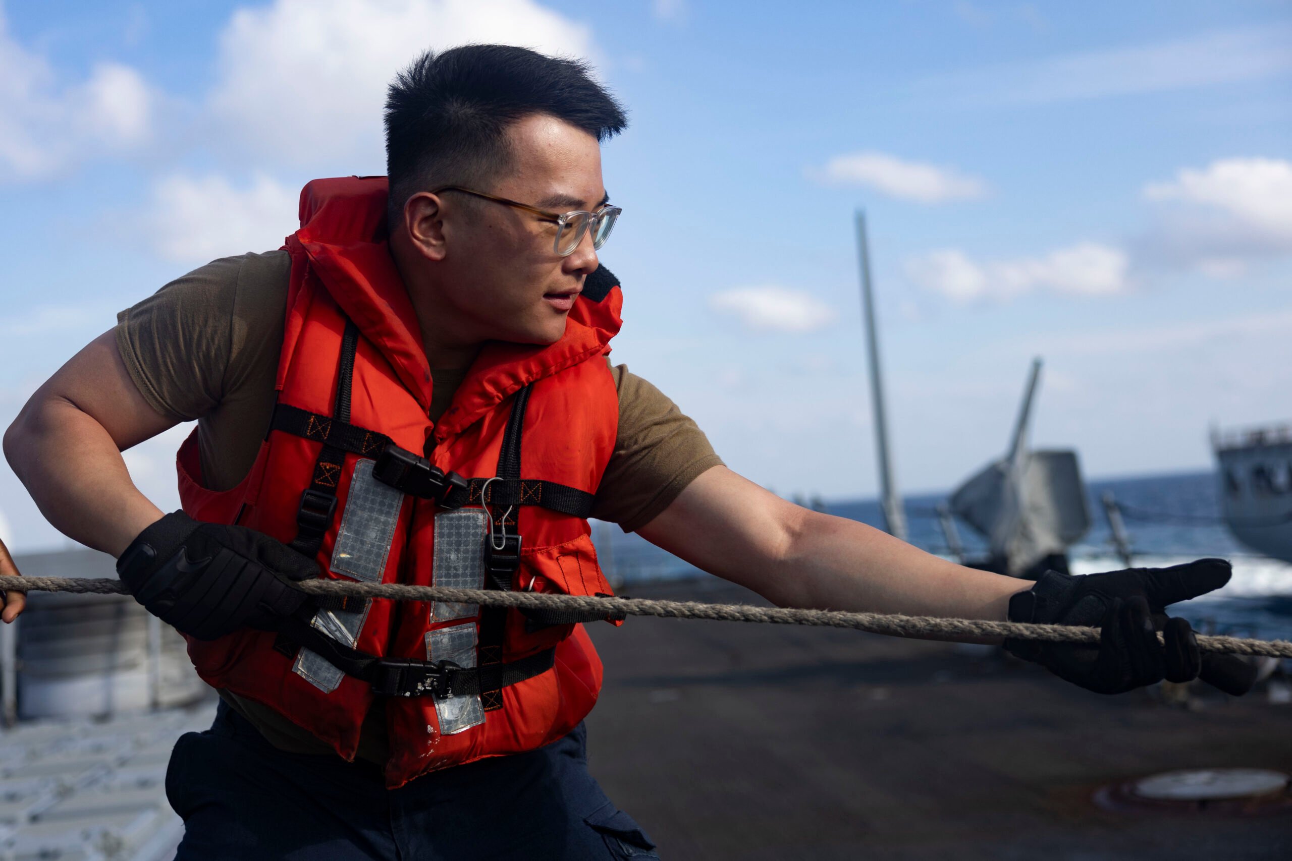 2025年7月13日,在海上補給期間,來自紐約皇后區的聲吶技術員(水面)水兵伊萬·王,在“阿利·伯克”級導彈驅逐艦“肖普”號(DDG 86)的後部導彈甲板上操控纜繩。“肖普”號隸屬於第5航母打擊羣。美國海軍供圖