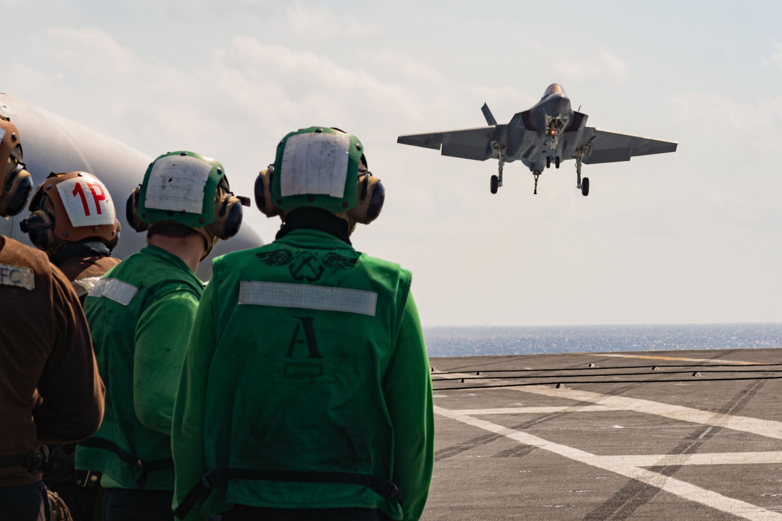 2025年7月13日,在蘇拉威西海航行期間,水兵們注視着隸屬於第147戰鬥攻擊機中隊(VFA 147)的一架F-35C“閃電II”戰鬥機降落在“尼米茲”級航空母艦“喬治·華盛頓”號(CVN 73)的飛行甲板上。美國海軍供圖