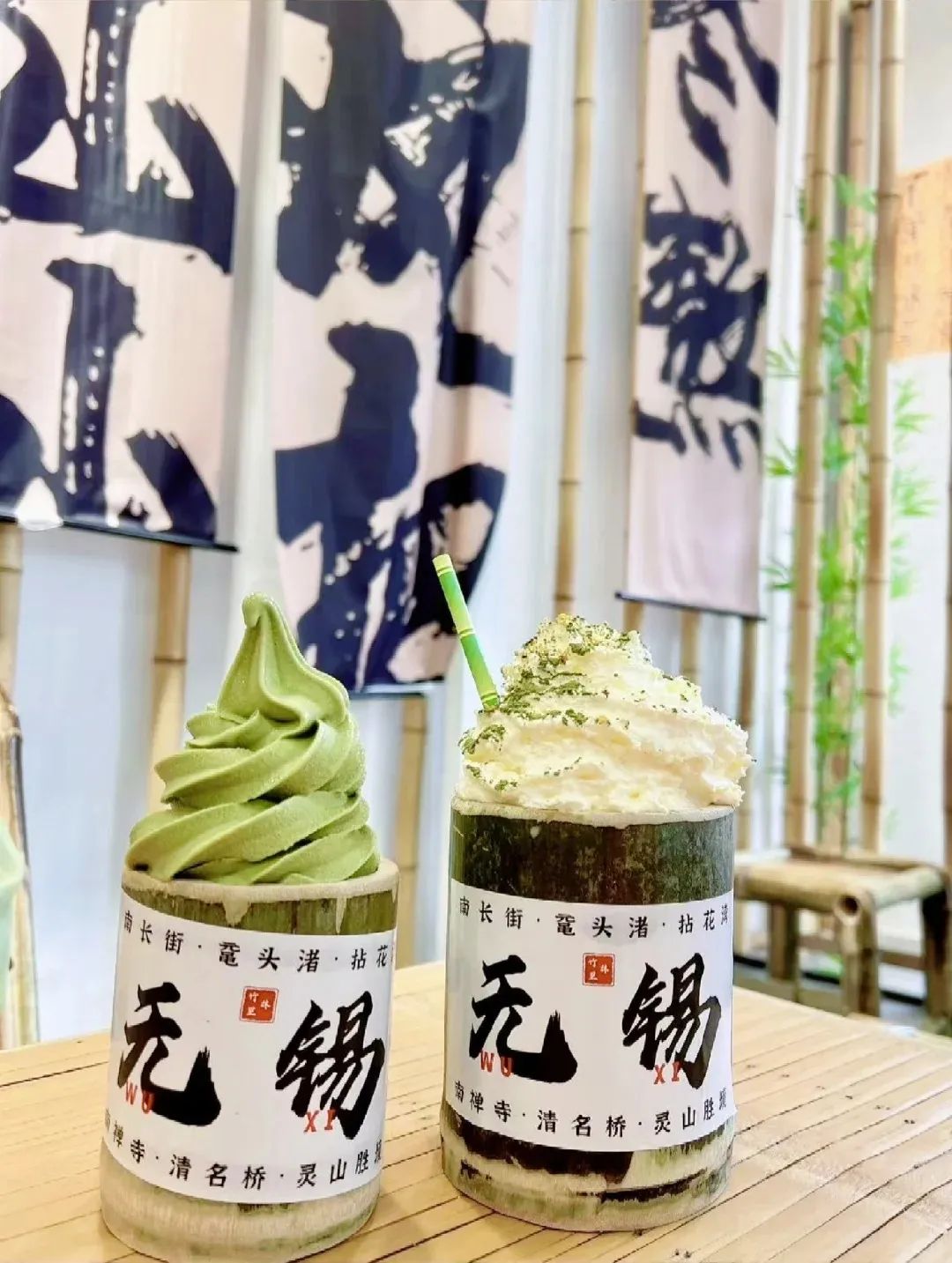 許多景區都會售賣一種動輒三四十元的竹筒奶茶,竹筒上貼着城市名的標籤,加上厚厚的奶蓋,拍照十分出片。