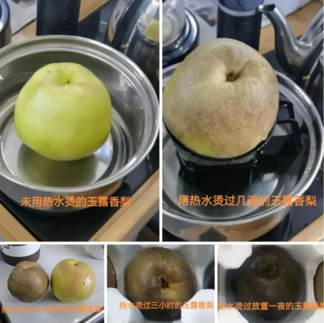 但其實這種“川藏特產梨”外表的黑色,只不過是用熱水反覆淋在普通梨上,使表皮氧化變黑,再放置一天後達到的效果。