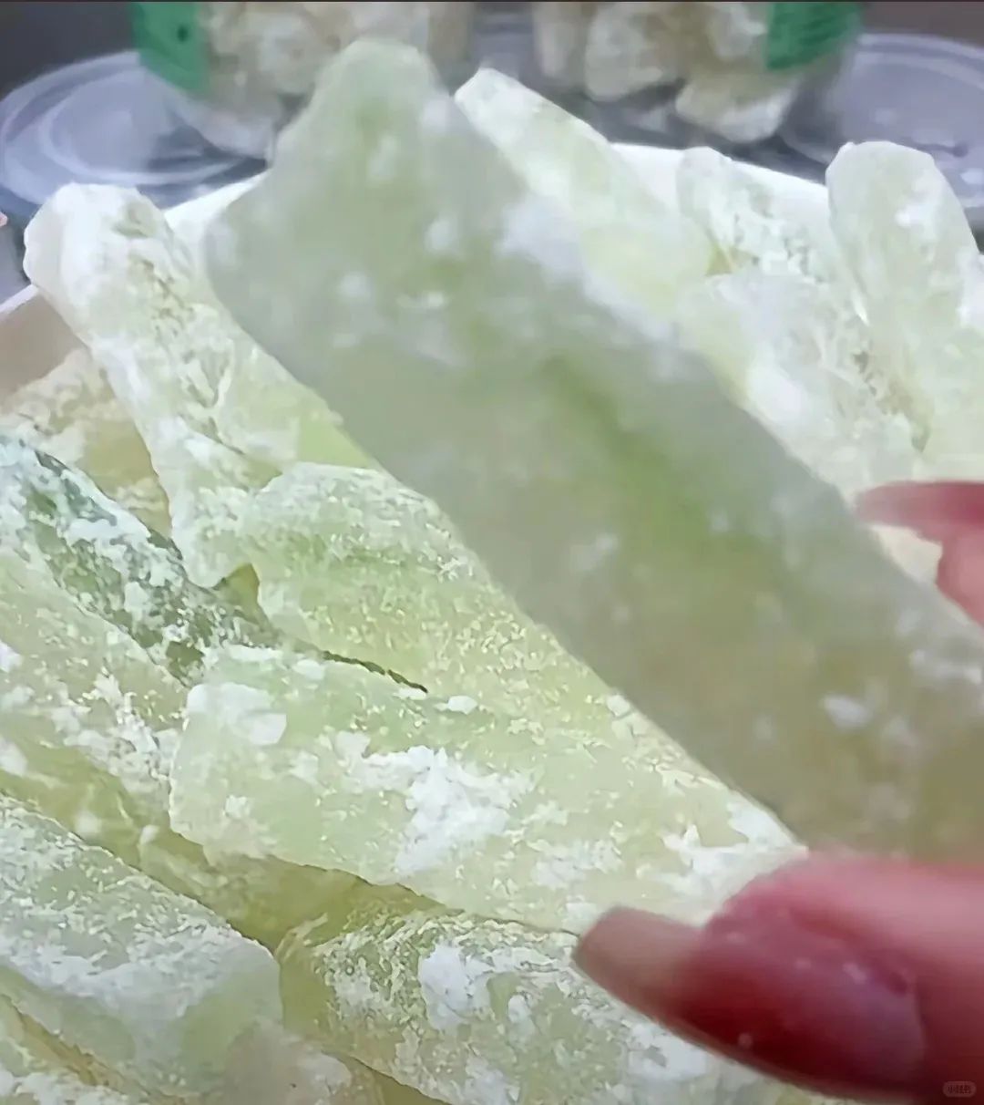 它是用沒成熟的小桃子,加色素、香精和大量的糖泡出來的,吃上去像是橡皮,還有非常濃烈的甜味和劣質香精味。