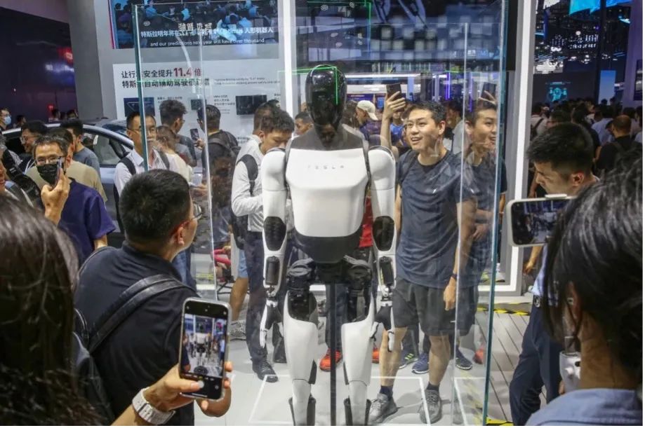 2024年7月,在上海世界人工智能大會上,參觀者圍觀了特斯拉展出的“擎天柱”機器人。圖源:網絡