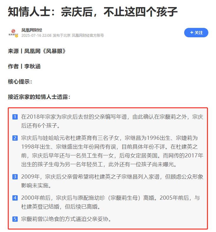 但是呢,2017年,宗慶後確實生下了一個孩子,只是孩子他媽不是杜建英罷了,而是另一名女員工。在這名女員工之前,宗慶後還與另外兩名女性,生了兩個孩子。