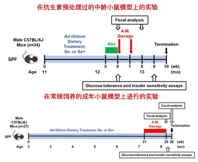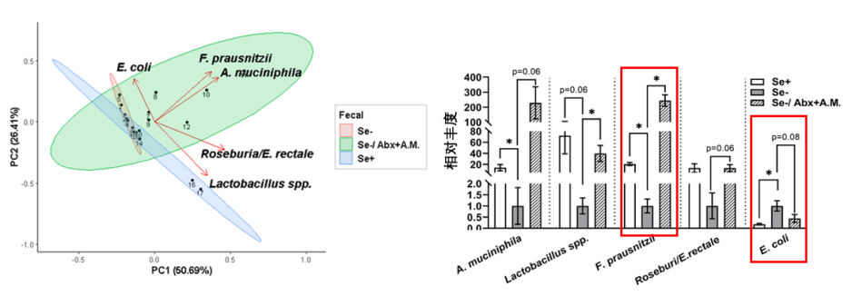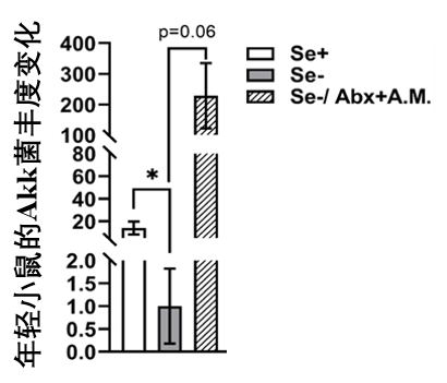 圖注:Se+、-代表是否缺硒,Abx為抗生素預處理,A.M.為餵食Akk