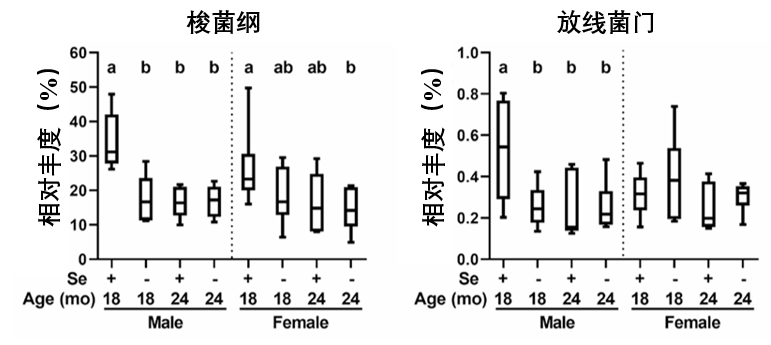 以雄性小鼠為例,在遭受缺硒與衰老雙重“debuff”後,其體內兩種能夠產生短鏈脂肪酸(丁酸)的益生菌丰度明顯降低:梭菌綱(Clostridia)和放線菌門(Actinobacteria)(它們恰好是腸道里少數幾個“吃硒大户”)。