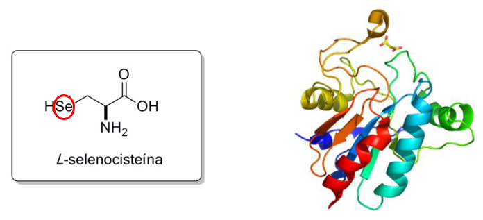 圖注:L-硒代半胱氨酸三維結構(原子色標:Se=黃,O=紅,N=藍)與蛋白結合位點