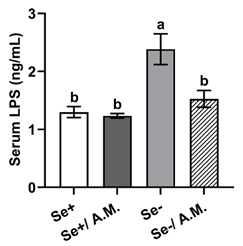 隨着腸道屏障功能的完備,腸道內毒素的泄漏問題也得到改善:缺硒小鼠血液中脂多糖(LPS,引發全身性低度炎症的罪魁禍首)的濃度出現降低,源頭得到控制,下游腸道局部的炎症反應也就跟着緩解,促炎因子Tnf-α,Il-6的表達降低(見上圖紅框處)。
