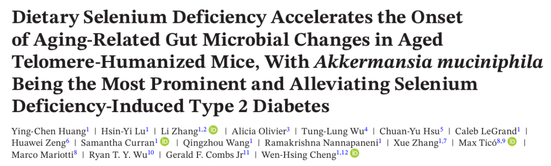 [1] Huang, Y. C., Lu, H. Y., Zhang, L., Olivier, A., Wu, T. L., Hsu, C. Y., LeGrand, C., Zeng, H., Curran, S., Wang, Q., Nannapaneni, R., Zhang, X., Ticó, M., Mariotti, M., Wu, R. T. Y., Combs, G. F., Jr, & Cheng, W. H. (2025). Dietary Selenium Deficiency Accelerates the Onset of Aging-Related Gut Microbial Changes in Aged Telomere-Humanized Mice, With Akkermansia muciniphila Being the Most Prominent and Alleviating Selenium Deficiency-Induced Type 2 Diabetes. Aging cell, e70130. Advance online publication. https://doi.org/10.1111/acel.70130