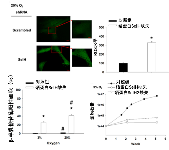 圖注:在人類成纖維細胞(MRC-5)中敲低SelH後,這些細胞表現出典型的加速衰老特徵(ROS水平增加、衰老標誌物陽性率升高、增殖停滯)[2]