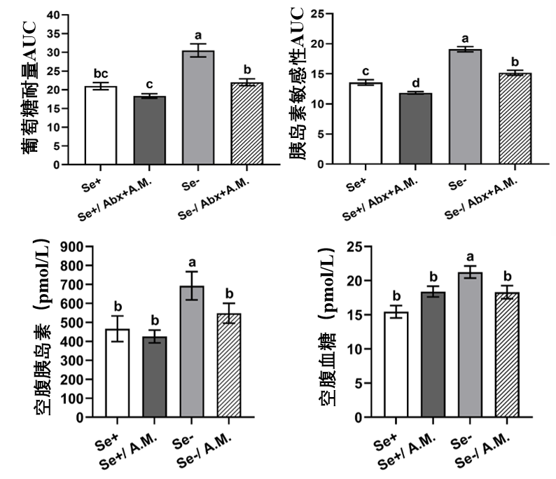 無論小鼠是否經過抗生素預處理,補充 Akk 菌都能一致性地改善其葡萄糖耐量(處理葡萄糖的能力)和胰島素敏感性,並且降低缺硒小鼠在空腹狀態下的血糖和胰島素水平,使其趨近健康水平。