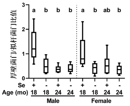 回到本篇研究,缺硒造成的壓力還發生在腸道微生態系統上,通過基因測序,科學家們發現,缺硒小鼠體內厚壁菌門/擬桿菌門的比值,出現明顯降低(其降低與肥胖、炎症以及2型糖尿病等代謝性疾病密切相關,被視為腸道菌羣失衡的一個核心標誌)。