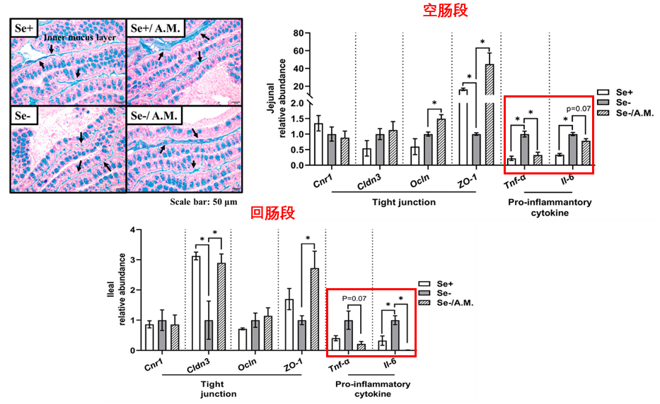 圖注:Se+、-代表是否缺硒,A.M.為餵食Akk,箭頭所指位置為腸道內黏液層