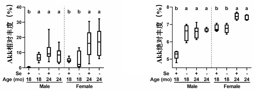 數據顯示,Akk有着驚人的增長幅度**:與年輕健康的雄性小鼠相比,僅是膳食缺硒這個因素,就能使腸道內Akk菌的丰度飆升22倍;而自然衰老(18—24月齡)則增加了38倍**。在缺硒與衰老的雙重壓力下,Akk菌幾乎成為了腸道菌羣中絕對的優勢物種。