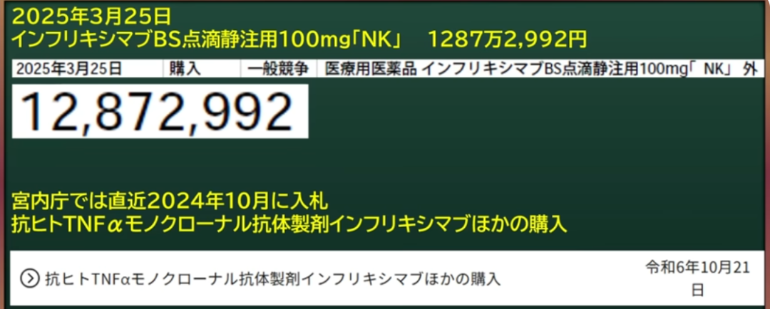 首先,日媒曾報道,2022年開始,宮內廳醫院大量購入了英夫利西單抗注射劑,2022年11月17日為715萬9834日元,23年5月10日為636萬5455日元,11月7日為851萬7245日元……