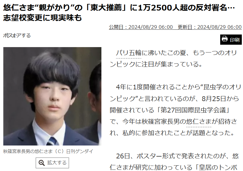 不僅如此,就連悠仁目前就讀的學校都有爭議。據瞭解,悠仁親王原計劃是“保送”東京大學,但卻引發了民眾強烈抗議,日本網友甚至發起在線請願活動,反對東大錄取悠仁,不到半個月超過1.2萬人簽名!