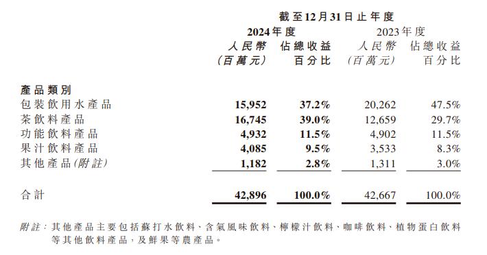 當然也有聲音會提到娃哈哈,畢竟鍾睒睒最大的輿論危機就是被宗慶後去世引發,這麼説還是有些道理的,受去年初的負面輿情影響,農夫山泉包裝飲用水營收2024年同比下降21.3%, 與此同時,宗馥莉也展現出對於無糖茶的絕對野心。