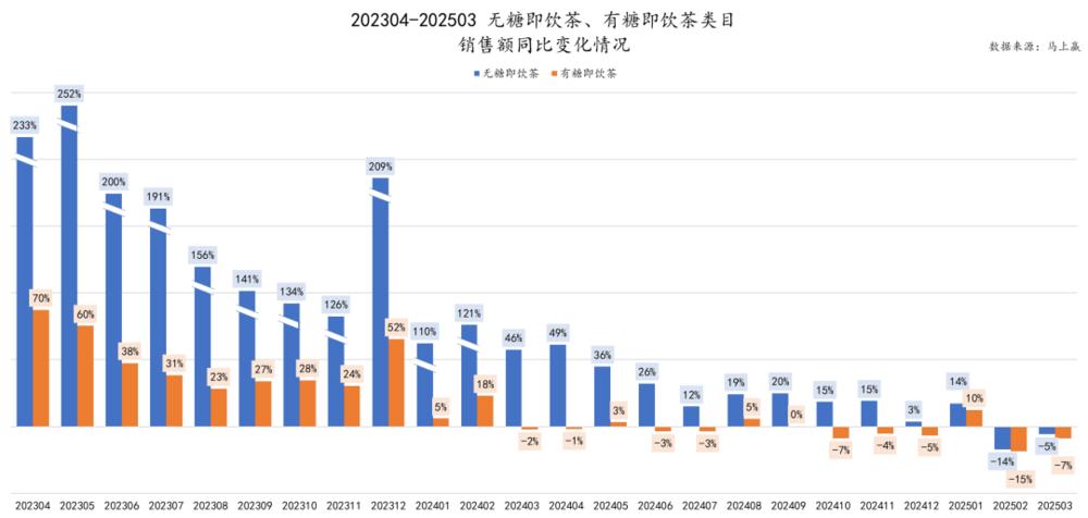 另外,拋開輿情這件事不談,如上文所言,無糖茶的爭鬥已經從規模化擴張邁向了價值深耕階段, 無糖茶這個賽道確實已經進入了存量博弈時期 —— 根據“馬上贏”數據,今年3月 無糖茶行業銷售額呈現負增長。