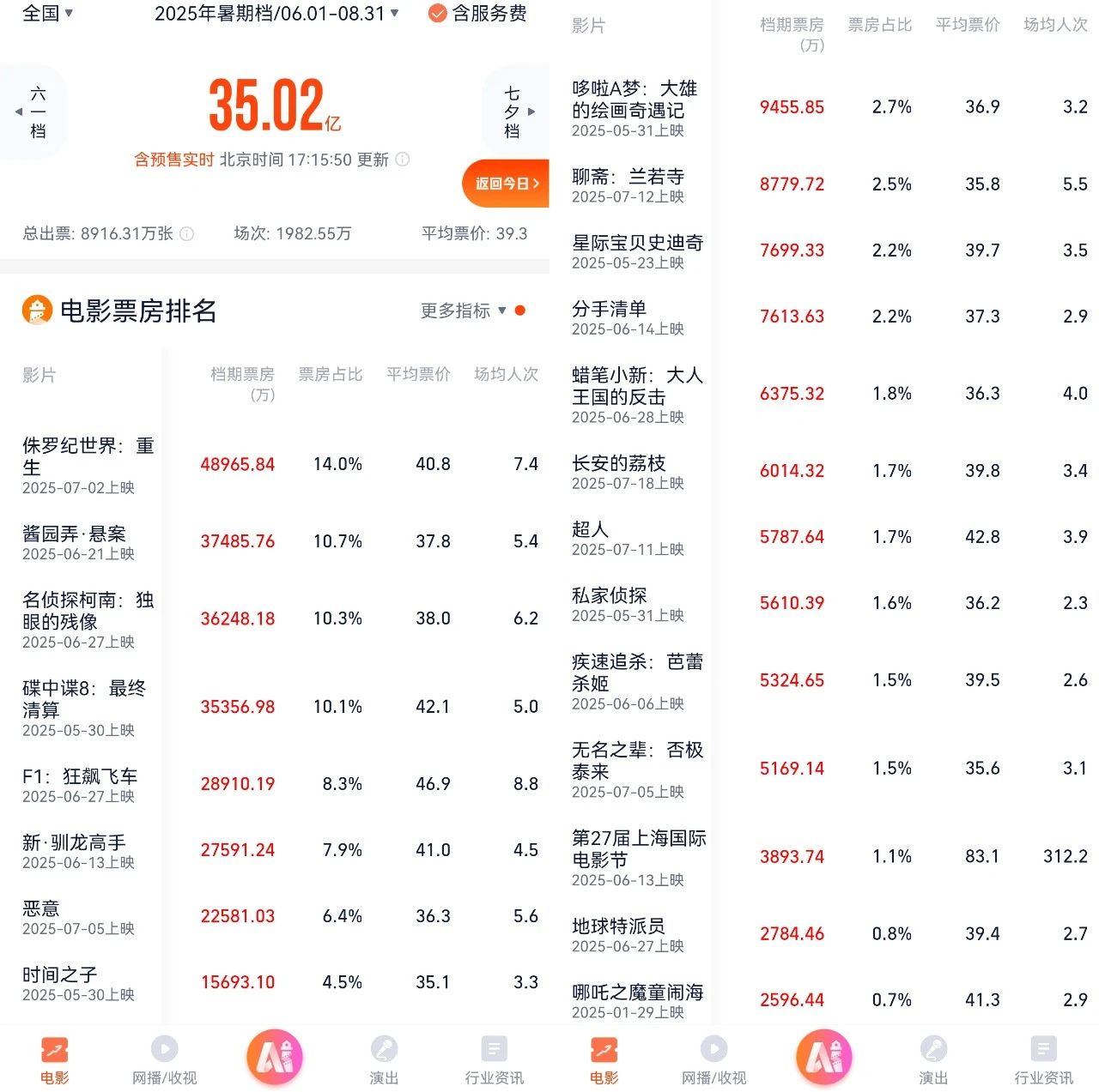 2025年暑期檔已經過半,首個破5億的電影還沒出現,《侏羅紀世界:重生》正以緩慢的增速奔向5億大關,而國產電影方面,已上映作品沒有達到5億+的實力。