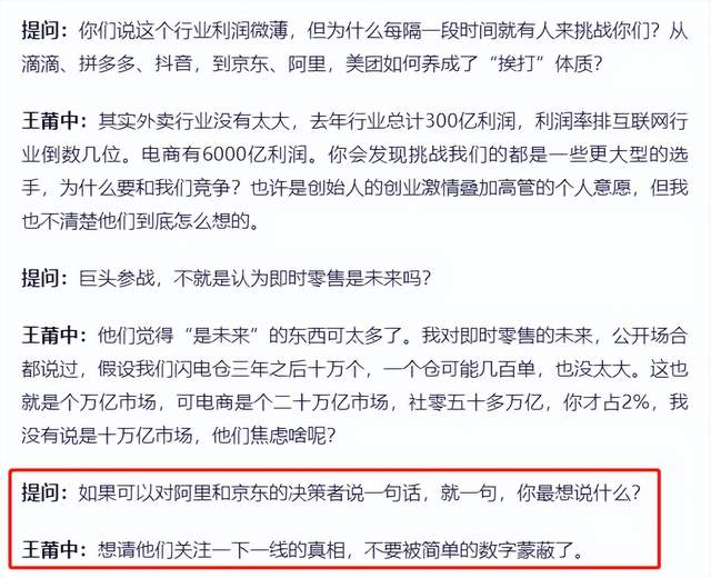 “目前,我們是外賣行業的最大參與者,已經在這個領域深耕超過10年,並且在過去10年中經歷了多次激烈的競爭,因此我們認為,這次美團依然處於最有利的位置,並且能夠再次取勝。”他這樣表示。