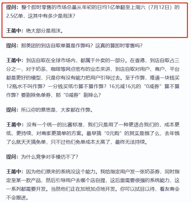 首先,王莆中承認了,整個即時零售的市場總量從年初的日均1億單翻至上週六(7月12日)的2.5億單,這其中絕大部分都是泡沫。