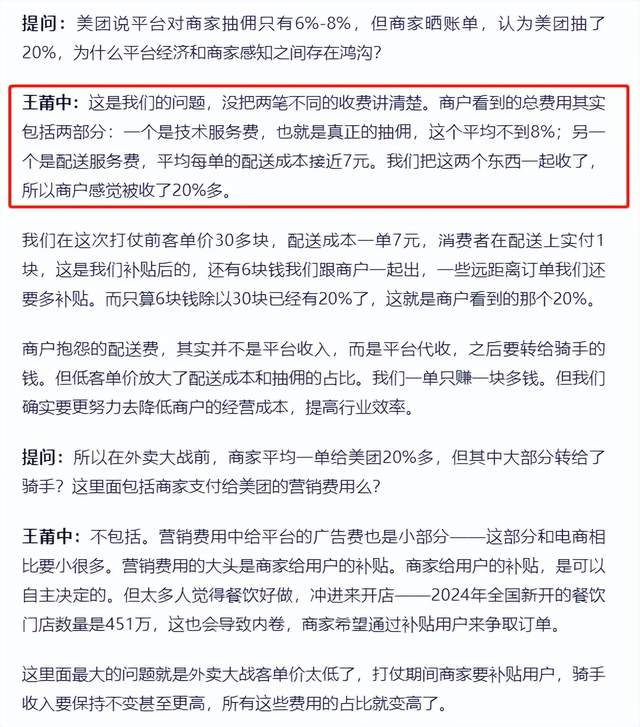 值得一提的是,在訪談中,王莆中還回應了“美團對商家抽成過高”的問題。