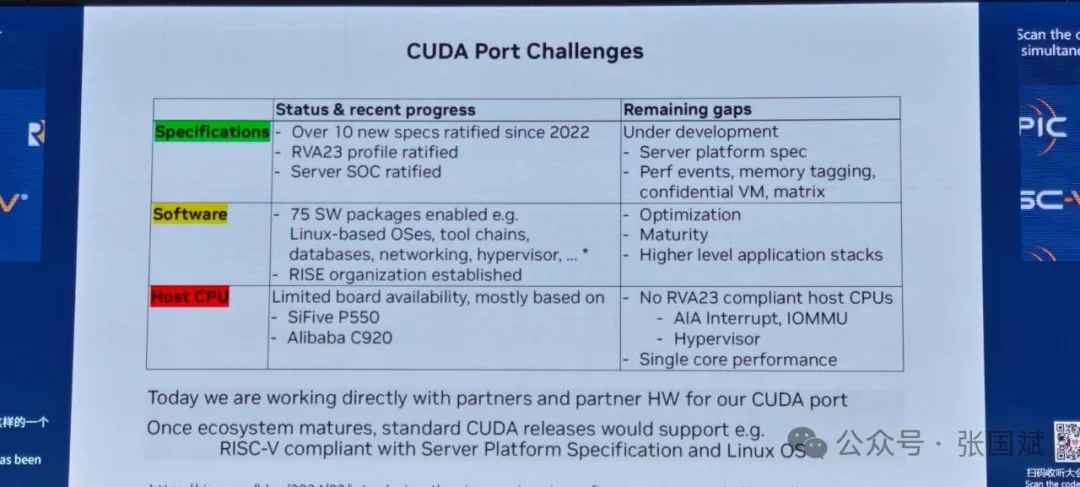 Frans也坦承,目前RISC-V仍面臨多個技術難點,主要集中在:對RVA23等新規範支持不完善;缺乏標準化的統一虛擬內存(UVM)模型,導致CPU與GPU數據交互複雜;部分主機CPU性能仍難匹配高性能GPU;需要更強的虛擬監管器和調試能力,以滿足複雜AI系統部署等。