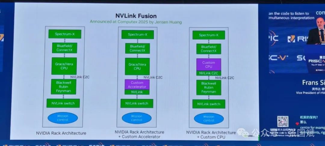 Frans在演講中展示了英偉達的系統級組件融合方案“NVLink Fusion”,該系統包括:自研CPU、高性能GPU、網絡組件(如交換芯片、互聯總線)灰機加速庫與深度軟件集成。