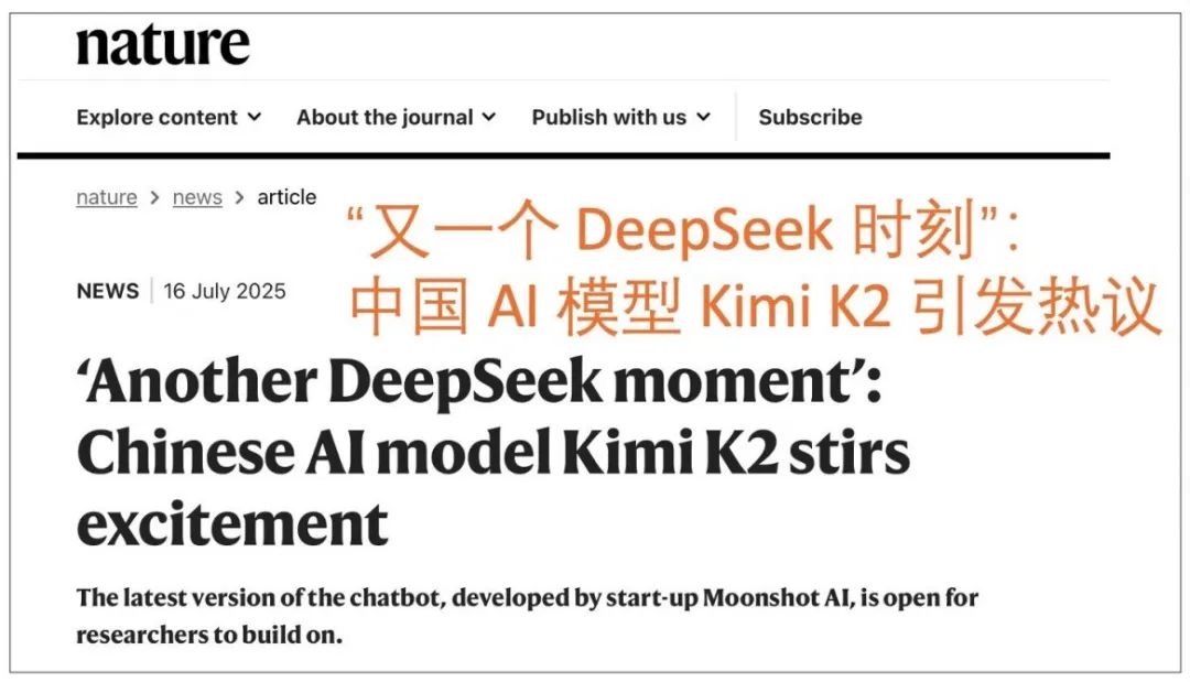 《自然》雜誌網站更是將Kimi K2發佈稱為“世界迎來又一個DeepSeek時刻”,滿滿的都是“Make Kimi Great Again”既視感。
