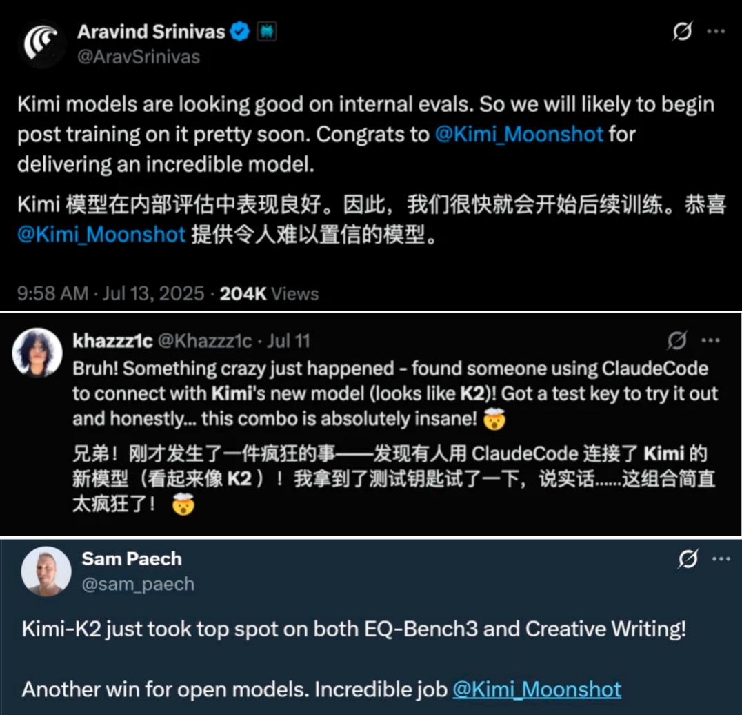 Kimi K2推出後,獨角獸Perplexity CEO阿拉温德在社交媒體表示,基於Kimi K2模型的出色表現,公司將會利用K2進行後訓練,上一個被該公司用於技術訓練的中國模型,是DeepSeek R1;全球最大開源AI社區Hugging Face聯合創始人托馬斯表示,不斷突破極限挑戰閉源的K2模型令人難以置信。