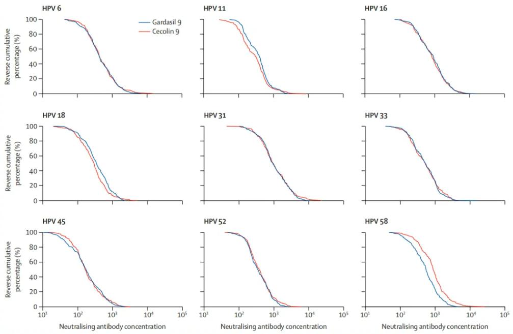 功能性中和抗體是科學界公認的HPV疫苗發揮保護作用的主要因素。通過這項嚴格的頭對頭比較研究,證明了馨可寧®9可誘導與Gardasil®9相似水平的保護性中和抗體,揭示了馨可寧®9具有與Gardasil®9相似的保護效果。