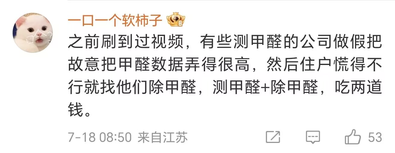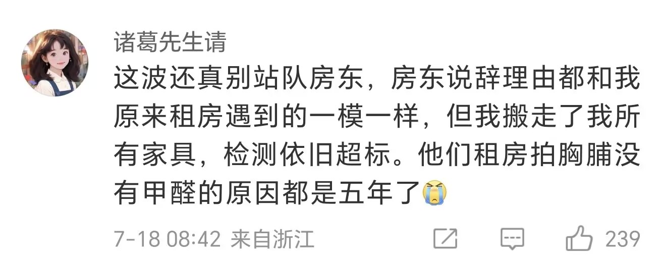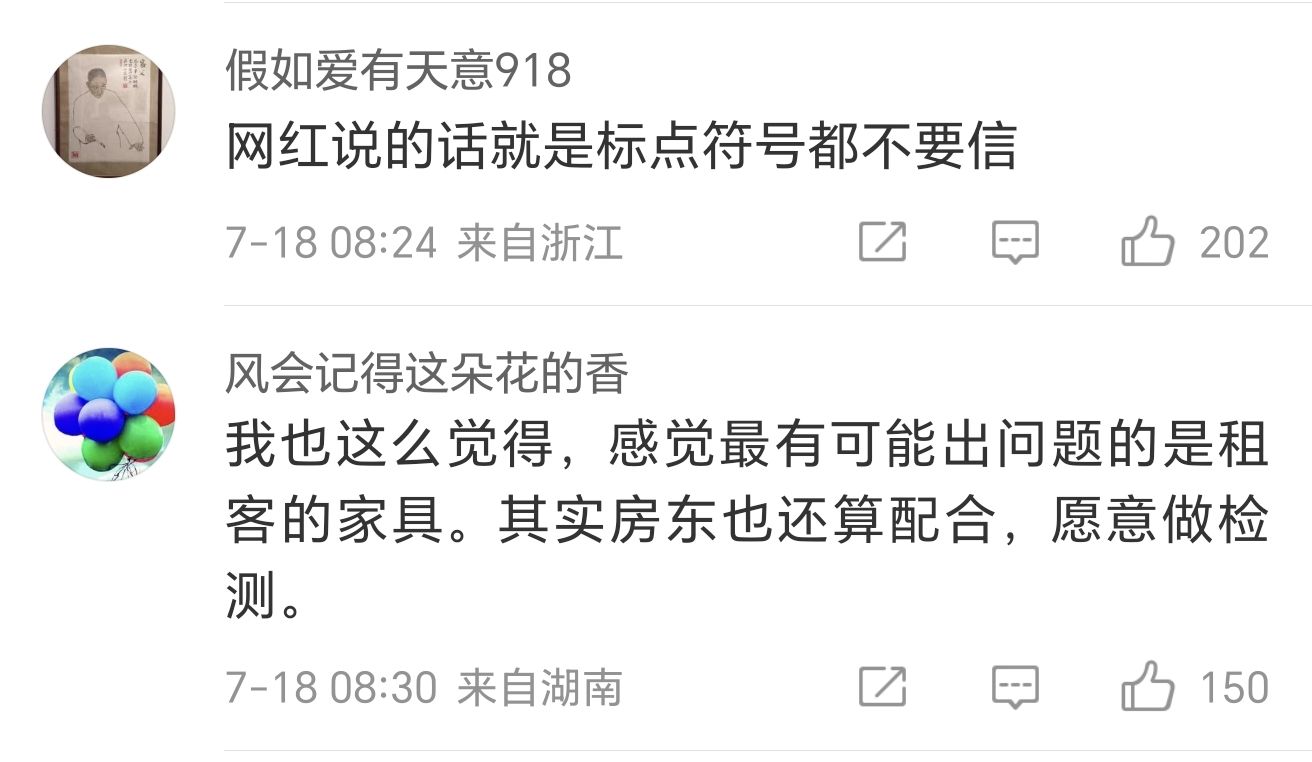 也有網友表示類似的事情自己也遇到過,同樣都是之前有許多租客入住過,但房子依然存在甲醛超標的情況。
