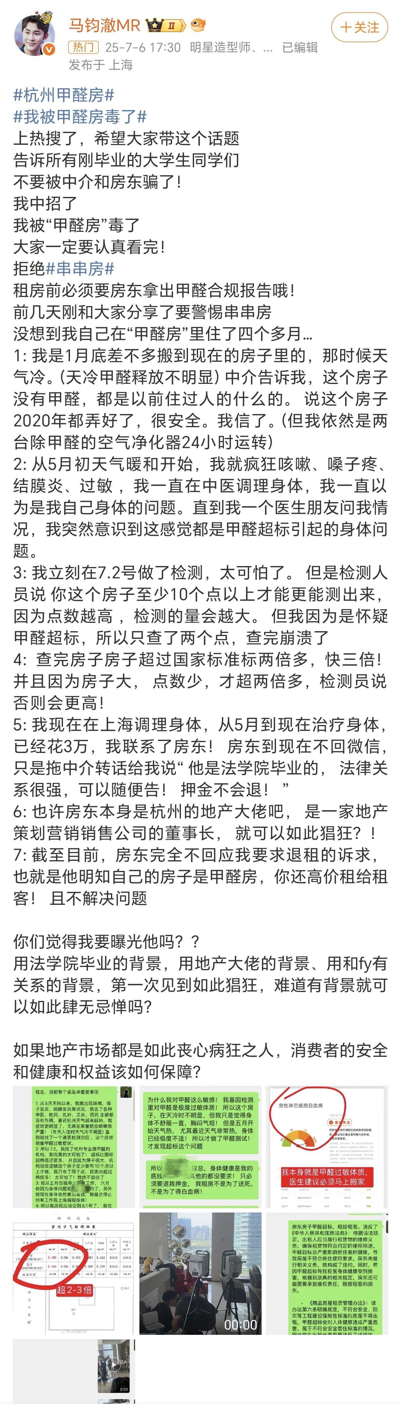 據極目新聞相關消息,最近,博主“馬鈞澈MR”(本姓馬)發帖稱,他在杭州入住一處月租6萬餘元的租房期間,出現咳嗽、過敏等身體異常情況,檢測機構的結果顯示房子甲醛含量超標近三倍,但房東不回應他退還全部押金的要求。