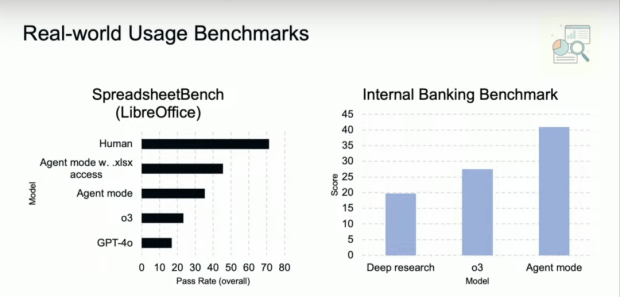 在演示中,OpenAI 的研究員通過讓 ChatGPT Agent 調用 API 操作,生成了 ChatGPT Agent 的基準測試報告。