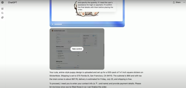 在 ChatGPT Agent 執行任務的時候,用户可以同步看到它操作計算機屏幕的過程,以及每一步操作相關的思維鏈。
