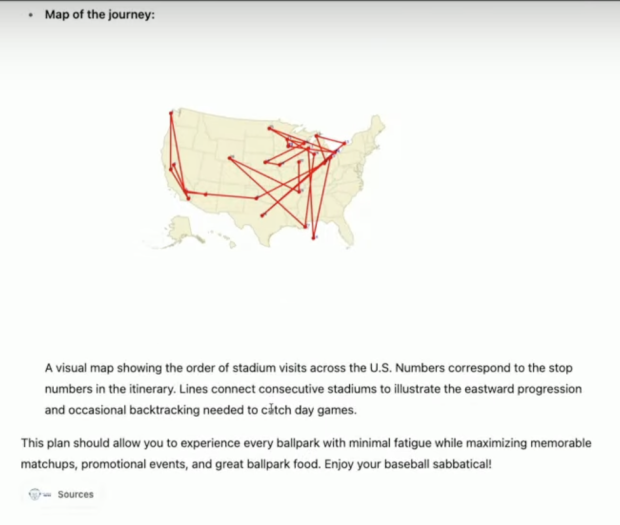 OpenAI 還提供了一個有趣的演示,讓 ChatGPT Agent 制定一個最佳行程,以遊覽所有 30 個 MLB 球場,最後以詳細的電子表格形式呈現最終計劃。