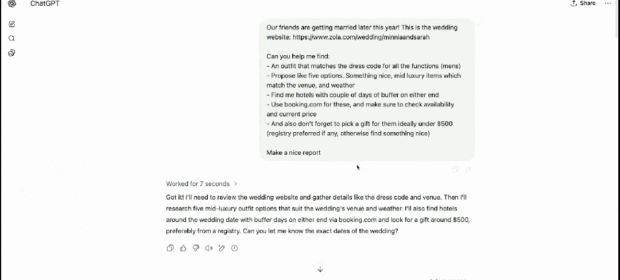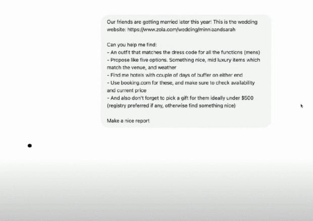 它會根據鏈接確定日期和婚禮場地,並以此來確定西裝的推薦,以及在哪裏可以買到,還有房源信息等,它還會提供關於禮物的建議。特別是,ChatGPT Agent 還提供瀏覽結果的屏幕截圖。