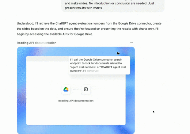 通過終端,它還可以調用 API,包括公共 API 和用於訪問用户私有數據源的 API( 例如 Google Drive、Google Calendar、Github Sharepoint 等)。你甚至還可以讓 ChatGPT 調用圖像生成 API 來生成圖像,這樣就可以為 PPT 等內容打造精美的視覺效果。類似 Deep Research Connector,只有當用户明確連接這些 API 時,它才能使用。