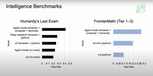 FrontierMath 基準測試用於衡量高級數學推理能力,ChatGPT Agent 在這個基準測試中達到了 27% 的通過率,超越了擁有 Python 編碼能力的 o4-mini 和 o3 。