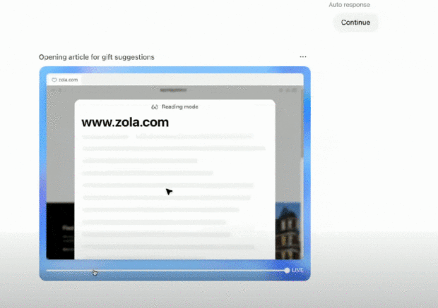 因為需要使用電腦,所以一開始,它需要設置環境,這一步通常需要一兩分鐘,快的話甚至不到 5 秒鐘( 實際演示中為 7 秒 )。準備好環境並理解了提示之後,ChatGPT Agent 會向用户確認自己的理解是否準確,用户點擊 “ continue ”,ChatGPT Agent 就會開始工作。