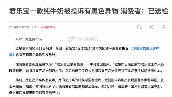 2024年10月,《紅星資本局》再次曝光了類似問題:江蘇無錫一名女子在君樂寶“優佳牧場”純牛奶中發現大量不明黑色異物。這些事件不僅損害了君樂寶的品牌形象,也對其市場信譽造成了嚴重打擊。