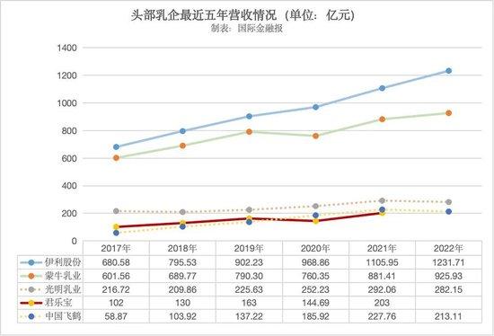 據《國際金融報》記者梳理的頭部乳企營收情況表顯示,2017年至2021年,君樂寶的營收逐年增長,分別為102億元、130億元、163億元、144.69億元和203億元,複合年增長率高達18.77%。