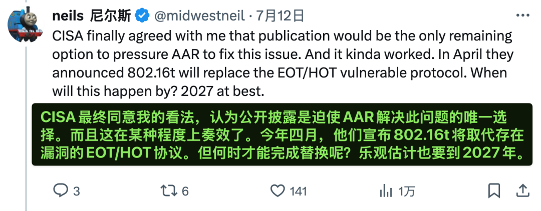 試想一下,如果他們承認這個存在了幾十年的漏洞,就得對遍佈全國裝載 EOT 的火車進行大規模召回和升級,這——